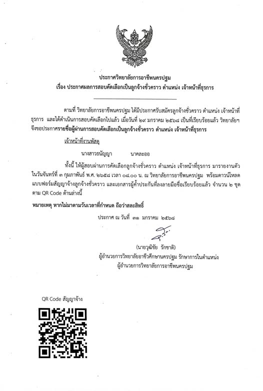 ประกาศวิทยาลัยการอาชีพนครปฐม เรื่อง ประกาศผลการสอบคัดเลือกเป็นลูกจ้างชั่วคราว ตำแหน่ง เจ้าหน้าที่ธุรการ