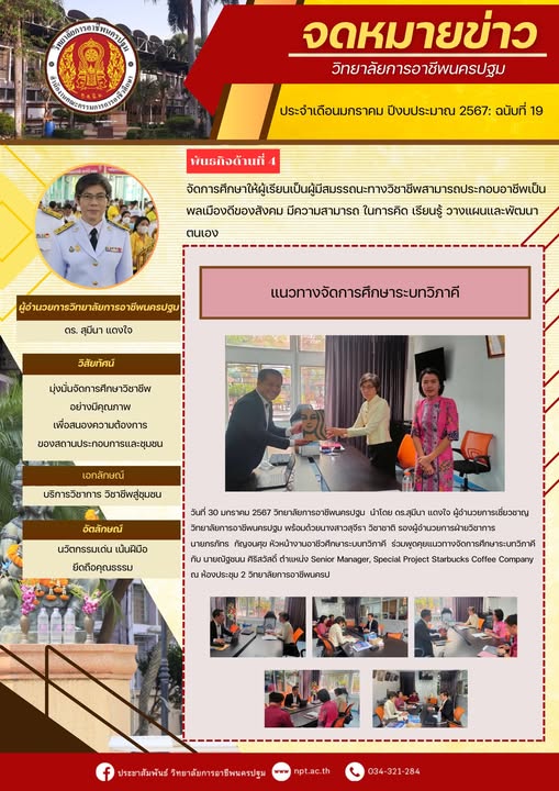 26.วันที่ 30 มกราคม 2567 วิทยาลัยการอาชีพนครปฐม นำโดย ดร.สุมีนา แดงใจ ผู้อำนวยการเชี่ยวชาญ วิทยาลัยการอาชีพนครปฐม พร้อมด้วยนางสาวสุจีรา วิชาชาติ รองผู้อำนวยการฝ่ายวิชาการ นายภรภัทร กัญจนศุข หัวหน้างานอาชีวศึกษาระบบทวิภาคี ร่วมพูดคุยแนวทางจัดการศึกษาระบทวิภาคี กับ นายณัฐชนน ศิริสวัสดิ์ ตำแหน่ง Senior Manager, Special Project Starbucks Coffee Company ณ ห้องประชุม 2 วิทยาลัยการอาชีพนครปฐม