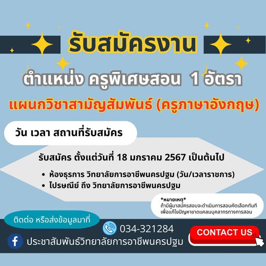 29.ประกาศวิทยาลัยการอาชีพนครปฐม เรื่อง รับสมัครลูกจ้างชั่วคราว ตำแหน่ง ครูพิเศษสอน แผนกวิชาสามัญสัมพันธ์ (ภาษาอังกฤษ) เอกสารประกอบการรับสมัคร :https://l.facebook.com/l.php…
