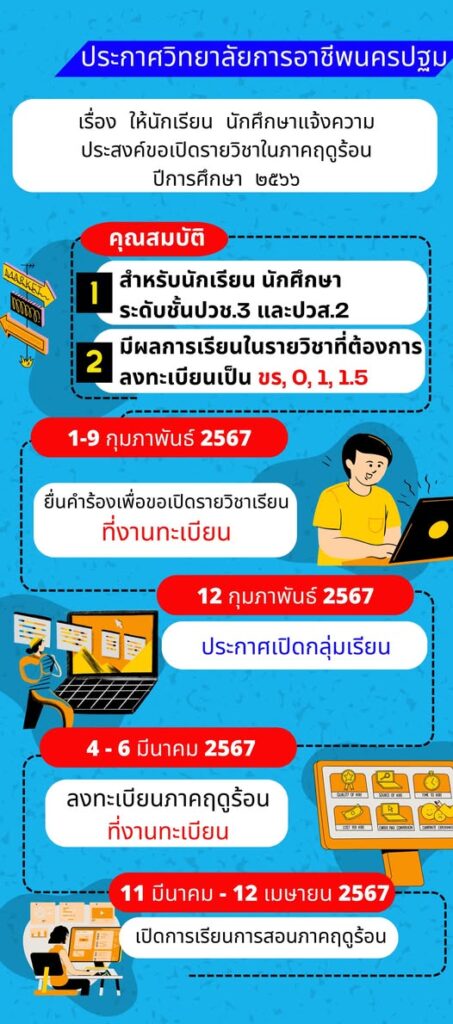30.ประกาศวิทยาลัยการอาชีพนครปฐม เรื่อง ให้นักเรียน นักศึกษาแจ้งความประสงค์ขอเปิดรายวิชาในภาคฤดูร้อน ปีการศึกษา 2566