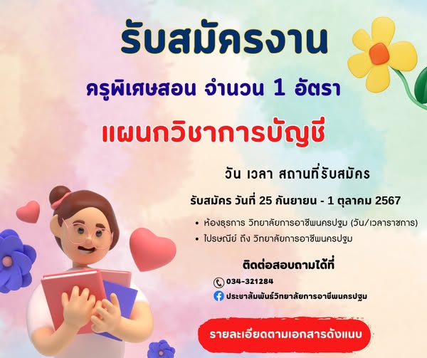 22.ประกาศวิทยาลัยการอาชีพนครปฐม เรื่อง รับสมัครลูกจ้างชั่วคราว ตำแหน่ง ครูพิเศษสอน (แผนกวิชาการบัญชี) รายละเอียดการรับสมัคร : https://drive.google.com/…/1XAYcbe0nGsm76llWBsz…/view…
