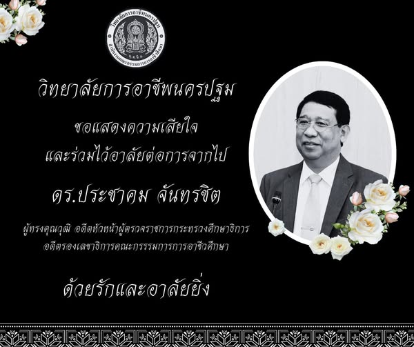 20.วิทยาลัยการอาชีพนครปฐม ขอแสดงความเสียใจและร่วมไว้อาลัยต่อการจากไป ดร.ประชาคม จันทรชิต ผู้ทรงคุณวุฒิ อดีตหัวหน้าผู้ตรวจราชการกระทรวงศึกษาธิกาธิการ อดีตรองเลชาธิการคณะกรรรมการการอาชีวศึกษา ด้วยรักและอาลัยยิ่ง