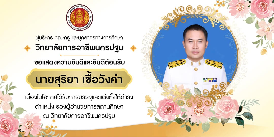 19.ผู้บริหาร คณะครู เเละบุคคลากรทางการศึกษาวิทยาลัยการอาชีพนครปฐม ขอเเสดงความยินดีเเละต้อนรับ นายสุริยา เชื้อวังคำ เนื่องในโอกาศได้รับการบรรจุเเละเเต่งตั้งให้ดำรงตำเเหน่งรองผู้อำนวยการสถานศึกษา ณ วิทยาลัยการอาชีพนครปฐม