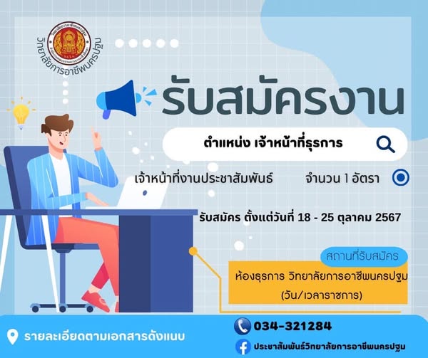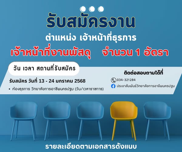 17.ประกาศวิทยาลัยการอาชีพนครปฐม เรื่อง รับสมัครลูกจ้างชั่วคราว ตำแหน่ง เจ้าหน้าที่ธุรการ รายละเอียดการรับสมัคร : https://drive.google.com/…/1uBTUttisqGNOHd…/view… ดาวน์โหลดใบสมัคร : https://drive.google.com/…/1df…/view…