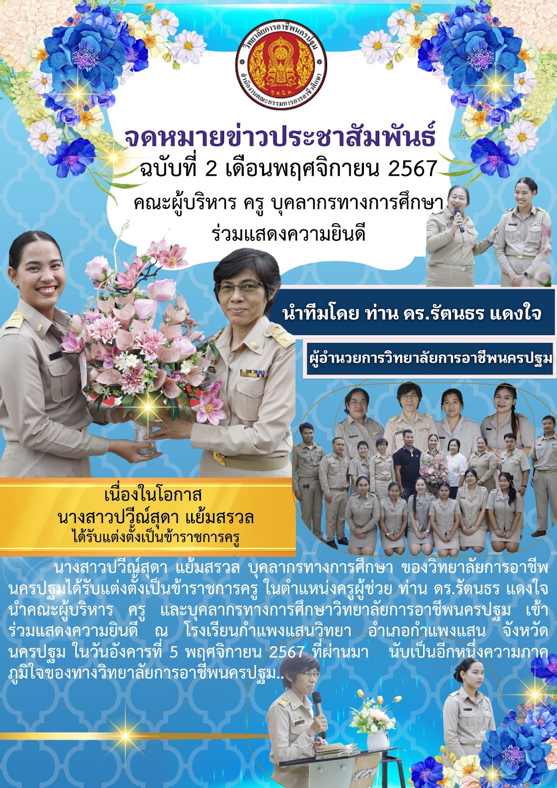 1.เนื่องในโอกาศ นาวสาวปวีณ์สุดา เเย้มสรวล ได้รับเเต่งตั้งเป็นข้าราชการครู นำทีมโดย ท่าน ดร.รัตนธร เเดงใจ ผู้อำนวยการวิทยาลัยการอาชัพนครปฐม ในตำเเหน่งครูผู้ช่วย ท่าน ดร.รัตนธร เเดงใจ นำคณะผู้บริหาร ครู เเละบุคลากรทางการศึกษาวิทยาลัยการอาชีพนครปฐม เข้าร่วมเเสดงความยินดี ณ โรงเรียนกำเเพงเเสนวิทยา อำเภอ กำเเพงเเสน จังหวัดนครปฐม ในวันอังคารที่ 5 พฤศจิกายน 2567 ที่ผ่านมา