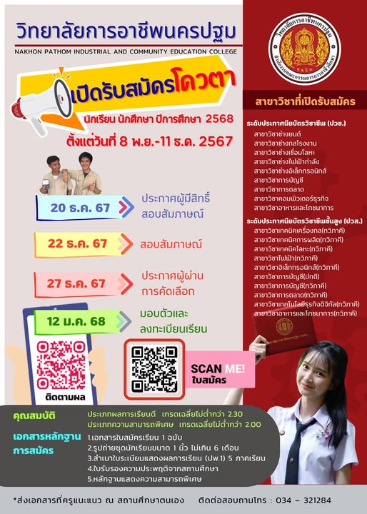 10.รับสมัครแล้ววันนี้!!!! เรียนดีมีความสุข การอาชีพสร้างคน สร้างชาติ อนาคตที่ดีเลือกได้ที่นี่วิทยาลัยการอาชีพนครปฐม ข้อมูลเพิ่มเติมพร้อมสมัคร แค่แสกน คิวอาร์โค๊ด ก็สมัครได้ทันที เรียนจบมีงานทำจริง ………………………………………… ติดตามข่าวสารจากทางวิทยาลัยฯได้ทาง Pagefacebook : ประชาสัมพันธ์ วิทยาลัยการอาชีพนครปฐม Website : www.npt.ac.th โทรศัพท์ ๐๓๔-๓๒๑-๒๘๔ #วิทยาลัยการอาชีพนครปฐม