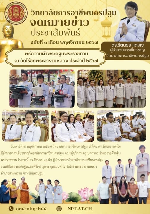 12.วันเสาร์ที่ ๙ พฤศจิกายน ๒๕๖๗ วิทยาลัยการอาชีพนครปฐม นำโดย ดร.รัตนธร แดงใจ ผู้อำนวยการเชี่ยวชาญวิทยาลัยการอาชีพนครปฐม คณะผู้บริหาร ครู บุคลากร ร่วมถวายผ้ากฐินพระราชทาน ในการนี้ ดร.รัตนธร แดงใจ ผู้อำนวยการวิทยาลัยการอาชีพนครปฐมได้เข้าร่วมพิธีฉลององค์กฐินและพิธีเจริญพระพุทธมนต์ ณ วัดโร่ขิงพระอารามหลวง อำเภอสามพราน จังหวัดนครปฐม