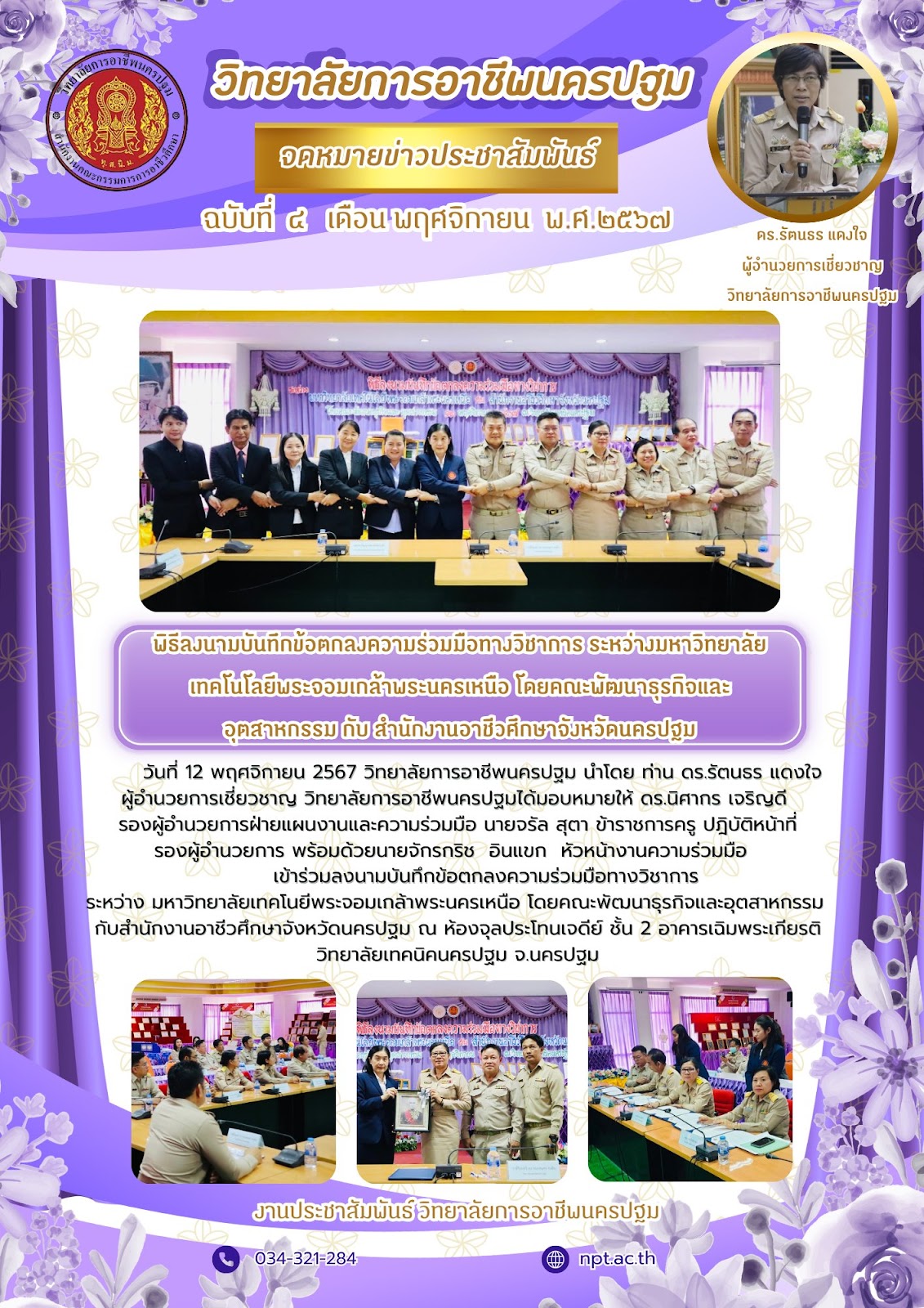 2.วันที่ 12 พฤศวิกายน 2567 วิทยาลัยการอาชีพนครปฐม นำโดย ท่าน ดร.รัตนธร แดงใจผู้อำนวยการเชี่ยวชาญ วิทยาลัยการอาชีพนครปฐมได้มอบหมายให้ ดร.นิศากร เจริญดี รองผู้อำนวยการฝ่ายแผนงานและความร่วมมือ นายจรัล สุตา ข้าราชการครู ปฏิบัติหน้าที่ รองผู้อำนวยการ พร้อมด้วยนายจักรกริช อินแขก หัวหน้างานความร่วมมือ เข้าร่วมพิธีลงนามบันทึกข้อตกลงความร่วมมือทางวิชาการ ระหว่าง มหาวิทยาลัยเทคโนยีพระจอมเกล้าพระนครเหนือ คณะพัฒนาธุรกิจและอุตสาหกรรมกับสำนักงานอาชีวศึกษาจังหวัดนครปฐม ณ ห้องจุลประโทนเจดีย์ ชั้น 2 อาคารเฉิมพระเกียรติ วิทยาลัยเทคนิคนครปฐม จ.นครปฐม