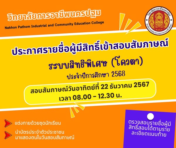 9.ประกาศรายชื่อผู้มีสิทธิ์สอบสัมภาษณ์พิจารณาคัดเลือกนักเรียน นักศึกษา ระบบสิทธิพิเศษ (โควตา) รายชื่อผู้มีสิทธิ์สอบ ระดับ ปวช. : https://drive.google.com/…/1puUUjtXsHuF…/view… รายชื่อผู้มีสิทธิ์สอบ ระดับ ปวส. : https://drive.google.com/…/1tFvBE_ZGyU7C5sk_4Y…/view… ………………………………………… ติดตามข่าวสารจากทางวิทยาลัยฯได้ทาง Pagefacebook : ประชาสัมพันธ์ วิทยาลัยการอาชีพนครปฐม Website : www.npt.ac.th โทรศัพท์ ๐๓๔-๓๒๑-๒๘๔ #วิทยาลัยการอาชีพนครปฐม