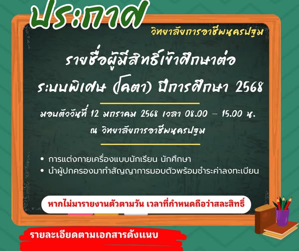 8.ประกาศวิทยาลัยการอาชีพนครปฐม เรื่อง รายชื่อผู้มีสิทธิ์เข้าศึกษาต่อระบบพิเศษ (โควตา) ระดับชั้นประกาศนียบัตรวิชาชีพ (ปวข.) และ ระดับชั้นประกาศนียบัตรวิชาชีพชั้นสูง (ปวส.) รายละเอียดการมอบตัว : https://drive.google.com/…/1fUw2w2Tp4bySdp7ojTOHr6983K4… ………………………………………… ติดตามข่าวสารจากทางวิทยาลัยฯได้ทาง Pagefacebook : ประชาสัมพันธ์ วิทยาลัยการอาชีพนครปฐม Website : www.npt.ac.th โทรศัพท์ ๐๓๔-๓๒๑-๒๘๔ #วิทยาลัยการอาชีพนครปฐม