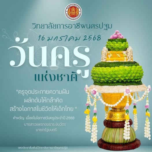 5.ที่สิบหก มกรา มาบรรจบ ขอน้อมนบ ระลึกถึง พระคุณศรี ศิษย์คนนี้ ขอกราบครู ผู้หวังดี บุญคุณนี้ มากล้น เกินแทนคุณ ——————————————————————– ติดตามข่าวสารจากทางวิทยาลัยฯได้ทาง Pagefacebook : ประชาสัมพันธ์ วิทยาลัยการอาชีพนครปฐม Website : www.npt.ac.th โทรศัพท์ ๐๓๔-๓๒๑-๒๘๔ #วิทยาลัยการอาชีพนครปฐมม