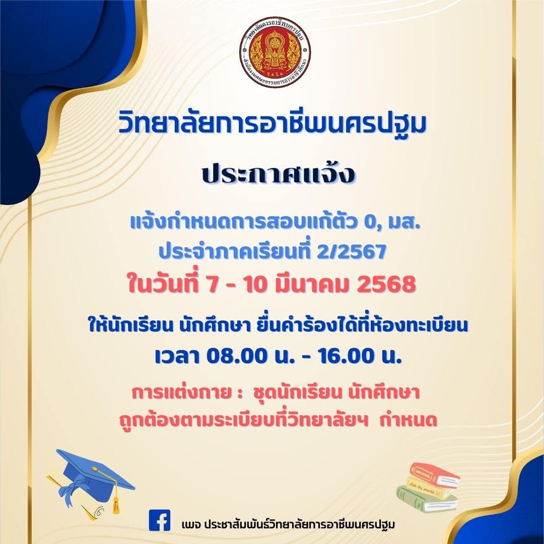 4.ประกาศวิทยาลัยการอาชีพนครปฐม เรื่อง แจ้งกำหนดการสอบแก้ตัว 0, มส. ประจำภาคเรียนที่2/2567 ——————————————- ติดตามข่าวสารจากทางวิทยาลัยฯได้ทาง Pagefacebook : ประชาสัมพันธ์ วิทยาลัยการอาชีพนครปฐม Website : www.npt.ac.th โทรศัพท์ ๐๓๔-๓๒๑-๒๘๔ #วิทยาลัยการอาชีพนครปฐม