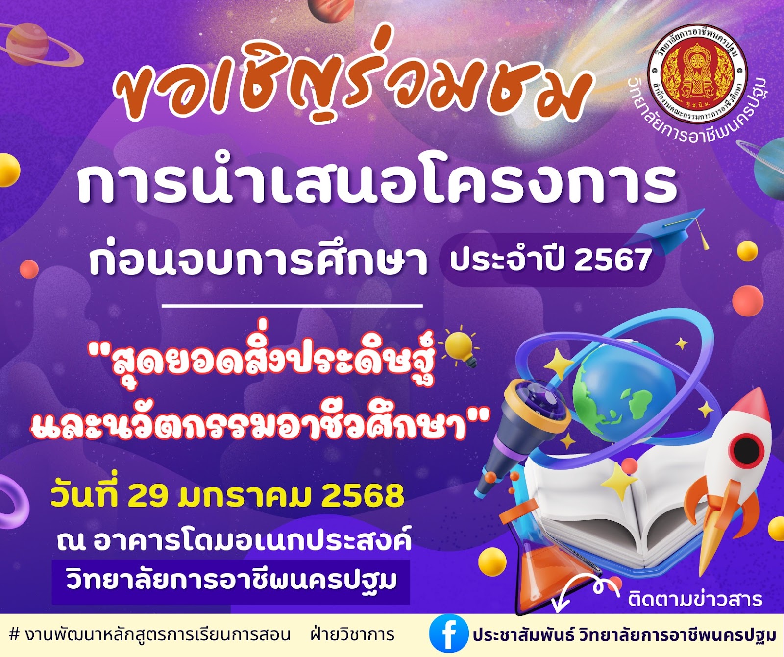 3.มีของดี ก็ต้องอวดบ้าง ขอเรียนเชิญทุกท่านที่สนใจสิ่งประดิษฐ์และนวัตกรรม เข้าร่วมชมการนำเสนอโครงการก่อนจบของนักเรียน นักศึกษา วิทยาลัยการอาชีพนครปฐม ประจำปีการศึกษา 2567 ——————————————- ติดตามข่าวสารจากทางวิทยาลัยฯได้ทาง Pagefacebook : ประชาสัมพันธ์ วิทยาลัยการอาชีพนครปฐม Website : www.npt.ac.thโทรศัพท์ ๐๓๔-๓๒๑-๒๘๔