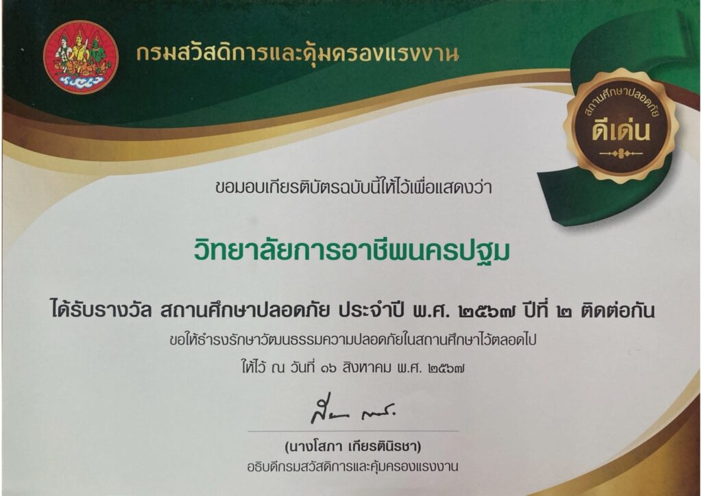 📌วิทยาลัยการอาชีพนครปฐม : รายงานข่าว 📆วันพุธที่ 25 มิถุนายน 2568 🔻ดร.จิราภร อเนกศุภพล ผู้อำนวยการวิทยาลัยการอาชีพนครปฐม พร้อมด้วย นายสุริยา เชื้อวังคำ รองผู้อำนวยการฝ่ายพัฒนากิจการนักเรียน นักศึกษา นายวรวิทย์ พลอยแดง หัวหน้างานปกครอง เข้ารับรางวัล สถานศึกษาปลอดภัย ประจำปีพ.ศ. 2567 ปีที่ 2 ติดต่อกัน ในพิธีมอบเกียรติบัตร โครงการสถานศึกษาปลอดภัย และสถานประกอบกิจการต้นแบบดีเด่น ด้านความปลอดภัย อาชีวอนามัย และสภาพแวดล้อมในการทำงาน ประจำปี 2567 โดยสำนักงานสวัสดิการและคุ้มครองแรงงานจังหวัดนครปฐม #วิทยาลัยการอาชีพนครปฐม #สถานศึกษาปลอดภัย #งานประชาสัมพันธ์
