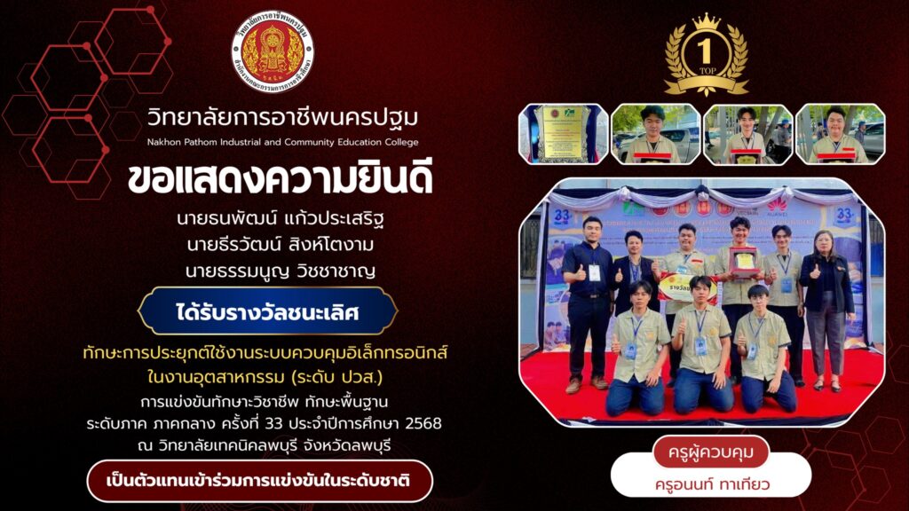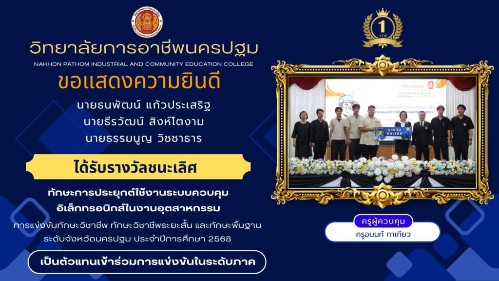 📌วิทยาลัยการอาชีพนครปฐม : รายงานข่าว 📆วันพุธที่ 24 ธันวาคม 2568 👉วิทยาลัยการอาชีพนครปฐม ขอแสดงความยินดีกับนักเรียนที่เข้าร่วม การแข่งขันทักษาะวิชาชีพ ทักษะพื้นฐาน ระดับภาค ภาคกลาง ครั้งที่ 33 ประจำปีกาศึกษา 2568 ณ วิทยาลัยเทคนิคลพบุรี จังหวัดลพบุรี 🏆ผลการแข่งขัน🏆 🔹ทักษะการประยุกต์ใช้งานระบบควบคุมอิเล็กทรอนิกส์ในงานอุตสาหกรรม (ระดับ ปวส.) 🥇รางวัลชนะเลิศอันดับ 1 1.นายธนพัฒน์ แก้วประเสริฐ 2.นายธีรวัฒน์ สิงห์โตงาม 3.นายธรรมนูญ วิชชาชาญ 👩🏫ครูผู้ควบคุมทีม คุณครูอนนท์ ทาเทียว 🌟ได้เป็นตัวแทนในการแข่งขันระดับประเทศต่อไป