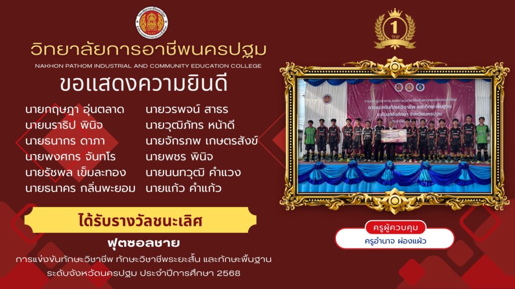 📣 ผลประกวดสิ่งประดิษฐ์ของคนรุ่นใหม่ ระดับภาคกลาง 2568 วันที่ 8–10 ธันวาคม 2568 ณ ศูนย์การค้าเซียร์ รังสิต ✨ บอกเลยว่าเด็กการอาชีพนครปฐมเค้าไม่ธรรมดา! ✨ 🏆 รางวัลที่ได้รับ 1️⃣ ไบโอแทงค์ 2025 🥇 มาตรฐาน เหรียญทอง 🏆 รองชนะเลิศอันดับ 2 🎉 ได้เป็น ตัวแทนภาคกลาง เข้าแข่งขันระดับชาติ! 👩🔬 ผู้ประดิษฐ์ : – นางสาวณัฐวลัย บุญมา – นางสาวบุษยา แสงคำ – นายเกรียงไกร คงสอน – นางสาวกัญญ์วรา พรูนพรม – นายจิราธิป แซ่จิ๋ว 👩🏫 ครูที่ปรึกษา : – นายชัยยุทธ ราษฎร์สภา – นายรังสรรค์ ลอยแก้ว – นางสาวกัญญภัทร พรหมเจริญ – นายพงษ์ศักดิ์ พลายศรี – นายจรัญ วรรณประเสริฐ – คณะครูแผนกช่างไฟฟ้ากำลัง 2️⃣ ระบบรดน้ำพืชอัจฉริยะด้วยสมองกลฝังตัวและ AI 🥈 มาตรฐาน เหรียญเงิน 🎖️ รับรางวัลชมเชย 👩🔬 ผู้ประดิษฐ์ : – นายอำนาจ อ่อนเจริญ – นางสาววลัยขวัญ ขันติยะ – นายกรกวี ธรรมเกตุ – นายอธิธัช ชาญชัย – นายธนัท แก้วสว่าง – นายเกียรติศักดิ์ ศิลาพงษ์ 👩🏫 ครูที่ปรึกษา : – นายอนนท์ ทาเทียว – นางรัศมี กาสินพิลา – นายศิวกานต์ ศรีวารี – ว่าที่ ร.ต. จิตปกรณ์ เตโชพันธ์ – นายศุภชัย จันทรอัมพร ✨เด็กเราทำได้อีกแล้ว! เก่งจริง ไม่ต้องพูดเยอะ🔥 #สิ่งประดิษฐ์ของคนรุ่นใหม่ #NakhonpathomVocationalCollege #วิทยาลัยการอาชีพนครปฐม #ศูนย์ไร่ขิง #งานประชาสัมพันธ์ 📋ข่าว : ประกวดสิ่งประดิษฐ์ของคนรุ่นใหม่ ระดับภาคกลาง 2568 ประมวลภาพกิจกรรม 🔗ดาวน์โหลดเพิ่มเติมได้ที่ : http://www.myqnapcloud.com/…/79hi9764o783p10r6wyyy1x7… 🎯———————————————————-🎯 👉ช่องทางการติดต่อ👈 📌วิทยาลัยการอาชีพนครปฐม ☎️โทร. 034-321284 📧E-mail : nakhonpathom03@vec.mail.go.th