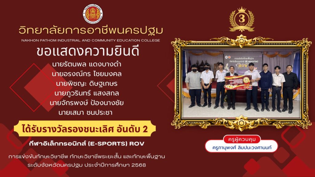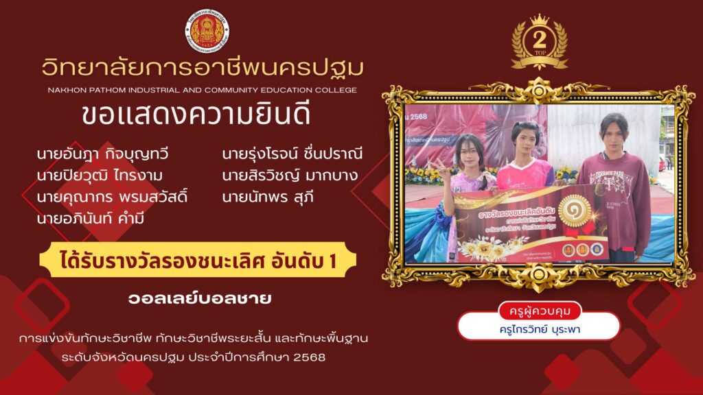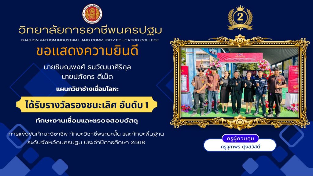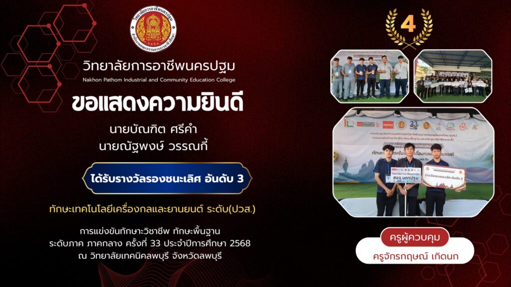 📌วิทยาลัยการอาชีพนครปฐม : รายงานข่าว 📆วันพุธที่ 24 ธันวาคม 2568 👉วิทยาลัยการอาชีพนครปฐม ขอแสดงความยินดีกับนักเรียนที่เข้าร่วม การแข่งขันทักษาะวิชาชีพ ทักษะพื้นฐาน ระดับภาค ภาคกลาง ครั้งที่ 33 ประจำปีกาศึกษา 2568 ณ วิทยาลัยเทคนิคลพบุรี จังหวัดลพบุรี 🔹ทักษะเทคโนโลยีเครื่องกลและยานยนต์ (ระดับ ปวส.) 🏅รางวัลรองชนะเลิศอันดับ 3 1.นายบัณฑิต ศรีคำ 2.นายณัฐพงษ์ วรรณกี้ 👩🏫ครูผู้ควบคุมทีม คุณครูจักรกฤษณ์ เกิดนก
