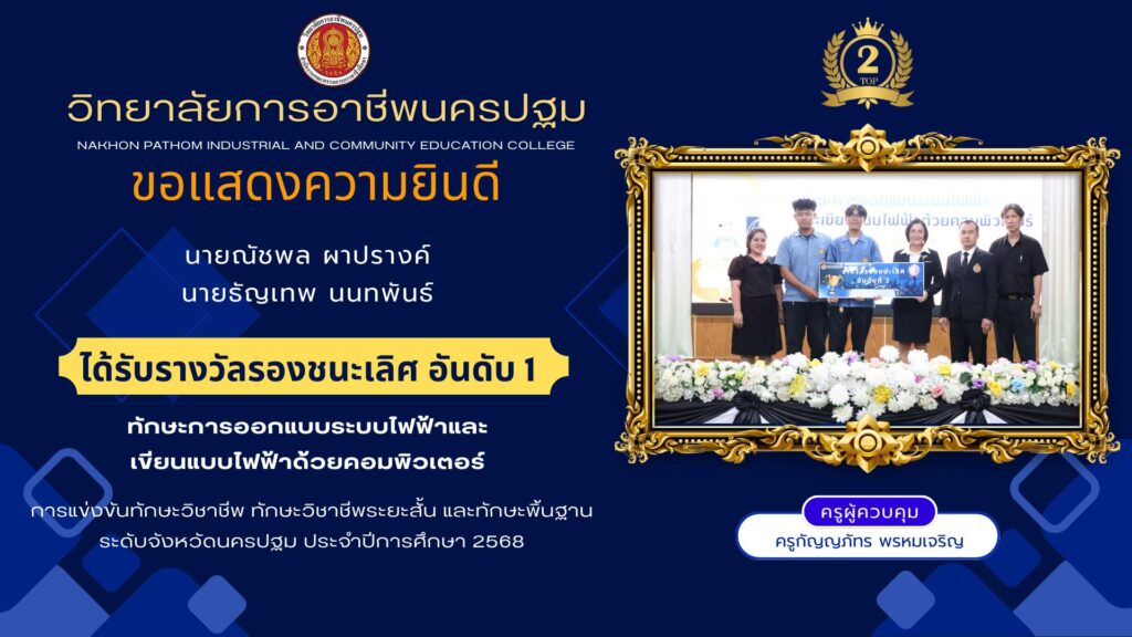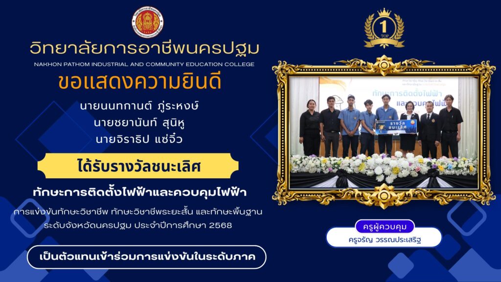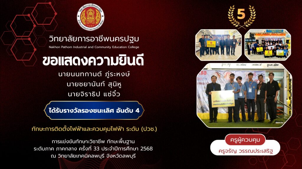 📌วิทยาลัยการอาชีพนครปฐม : รายงานข่าว 📆วันพุธที่ 24 ธันวาคม 2568 👉วิทยาลัยการอาชีพนครปฐม ขอแสดงความยินดีกับนักเรียนที่เข้าร่วม การแข่งขันทักษาะวิชาชีพ ทักษะพื้นฐาน ระดับภาค ภาคกลาง ครั้งที่ 33 ประจำปีกาศึกษา 2568 ณ วิทยาลัยเทคนิคลพบุรี จังหวัดลพบุรี 🏆ผลการแข่งขัน🏆 🔹ทักษะการติดตั้งไฟฟ้าและควบคุมไฟฟ้า (ระดับ ปวช.) 🎖️รางวัลรองชนะเลิศอันดับ 4 1.นายนนท์การ ภู่ระหงษ์ 2.นายชยานันท์ สุนิหู 3.นายจิราธิป แซ่จิ๋ว 👩🏫ครูผู้ควบคุมทีม คุณครูจรัญ วรรณประเสริฐ
