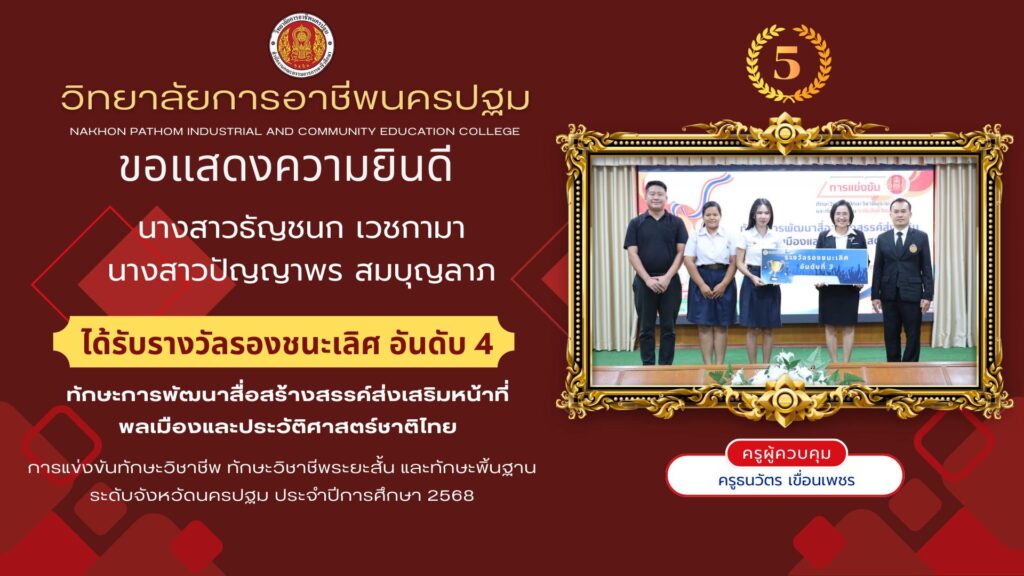 📌วิทยาลัยการอาชีพนครปฐม : ยินดี 👉วิทยาลัยการอาชีพนครปฐม ขอแสดงความยินดีกับ นักเรียน นักศึกษา ที่ได้เข้าร่วมการแข่งขันและได้รับรางวัลระดับนานาชาติ ในการแข่ง “Botok Cup” การประกวดนวัตกรรมและการทำสื่อออนไลน์สู่ตลาดจีน สำหรับนักศึกษาระดับอาชีวศึกษา ครั้งที่ 5 ประจำปี พ.ศ.2568 และมอบเกียรติบัตรให้แก่นักเรียน นักศึกษา 🥇ขอแสดงความยินดีกับทีม 明明 MingMing (ปวช.2 บัญชี) ได้รับรางวัล อันดับ 1 และเป็นตัวแทนเข้าร่วมแข่งขันรอบ 50 ทีมสุดท้าย ณ ประเทศจีน 🇨🇳 ทีม ” Ming Ming ” โดยนักเรียนแผนกวิชาการบัญชี 1. นางสาว ปิยะธิดา เหล่าโชติ 2. นางสาว จิราภัค ดอนเจยล 3. นาย วรากร หวังทำ ครูผู้ควบคุมทีม 1. ครูสุกัญญา รักษาพล 2. ครูอิศราภรณ์ แก้วพวง 🥉ขอแสดงความยินดีกับทีม The Moon (ปวช.2 เทคโนโลยีธุรกิจดิจิทัล) ได้รับรางวัล Third prize ทีม The Moon 1.นางสาวประภัสรา – 2.นางสาวณัฐชา บุญเชิด 3.นางสาวชนันท์ภัทร์ ปานเจริญ 4.นายธีรวัต ทับขัม 5.นายนนทกร ทองทัน ครูผู้ควบคุมทีม 1. ครูกฤษฎา รุ่งคูหา 2. ครูภาณุพงศ์ ลิมปนะวงศานนท์ 🏅ขอแสดงความยินดีกับทีม 冷冷 leng leng (ปวส.1 เทคโนโลยีธุรกิจดิจิทัล) ได้รับรางวัล Excellence award ทีม 冷冷 leng leng 1.นางสาวเพชรรินทร์ บัวผัน 2.นางสาวฐิตินันท์ สุภีย์ 3.นายกิตติพัต ทิพย์แสง ครูผู้ควบคุมทีม 1. ครูกฤษฎา รุ่งคูหา 2. ครูอิศราภรณ์ แก้วพวง 📋ข่าว : การแข่ง “Botok Cup” ประมวลภาพกิจกรรม 📷ภาพ : นางสาวสุภัทรา ปุรินทะ ประมวลภาพกิจกรรม 🔗ดาวน์โหลดเพิ่มเติมได้ที่ : http://www.myqnapcloud.com/…/79hi9764o783p10r6wyyy1x7… ====================================== 👉ช่องทางการติดต่อ👈 📌วิทยาลัยการอาชีพนครปฐม ☎️โทร. 034-321284 📧E-mail : nakhonpathom03@vec.mail.go.th