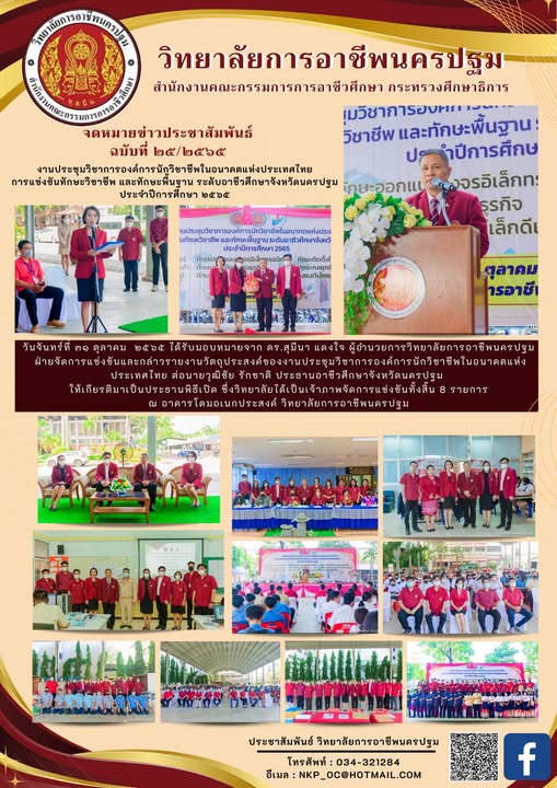 วันจันทร์ที่ ๓๑ ตุลาคม ๒๕๖๕ ได้รับมอบหมายจาก ดร.สุมีนา แดงใจ ผู้อำนวยการวิทยาลัยการอาชีพนครปฐม ฝ่ายจัดการแข่งขันและกล่าวรายงาน วัตถุประสงค์ของงานประชุมวิชาการองค์การนัก วิชาชีพในอนาคตแห่งประเทศไทย ต่อท่านผอ.วุฒิ ชัย รักชาติ ประธานอาชีวศึกษาจังหวัดนครปฐม ให้เกียรติมาเป็นประธานพิธีเปิดการแข่งข้นทักษะวิชาชีพ และวิชาพื้นฐาน ซึ่งวิทยาลัยได้เป็นเจ้าภาพ จัดการแข่งขันทั้งสิ้น ๘ รายการ ขอบคุณแผนกวิชา อาหารและโภชนาการ ที่ดูแลอาหารว่างและอาหาร กลางวันให้กับคณะกรรมการ และผู้เข้าแข่งขัน ขอบคุณงานอาคารสถานที่