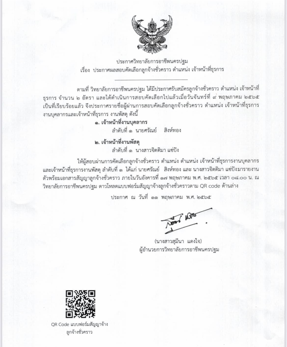 ประกาศผลสอบคัดเลือกลูกจ้างชั่วคราว ตำแหน่งเจ้าหน้าที่ธุรการ รายงานตัววันอังคารที่ 17 พฤษภาคม 65 เวลา 8.00น.