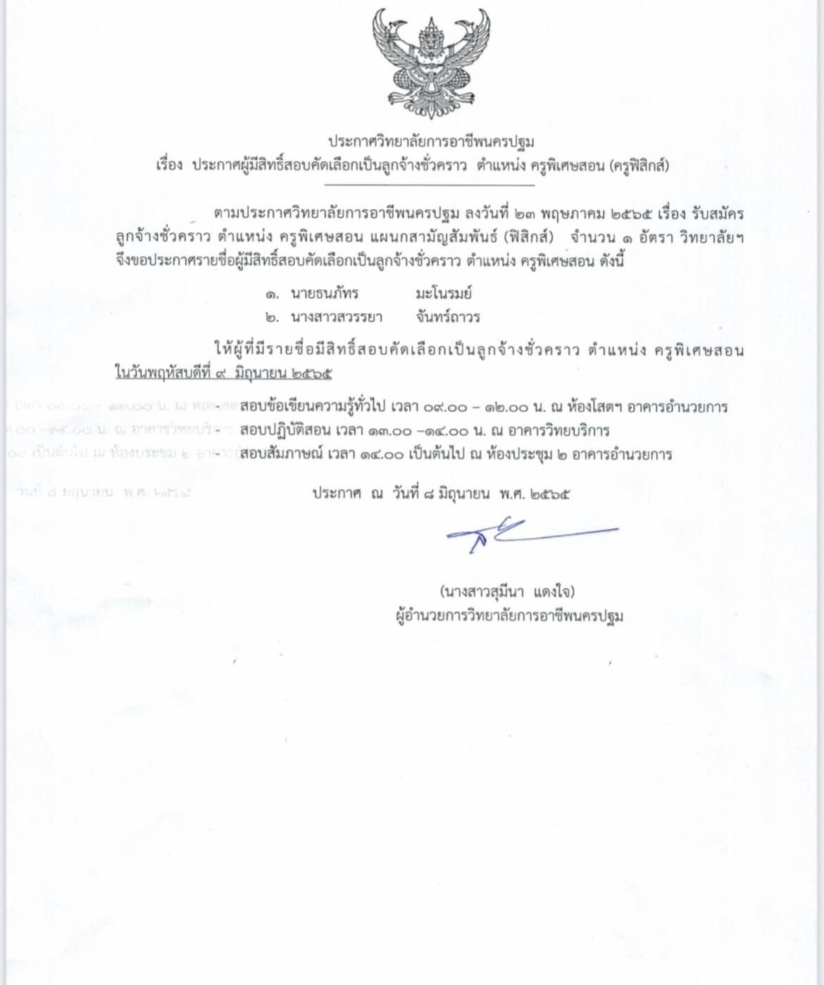 ประกาศผู้มีสิทธิ์สอบคัดเลือกเป็นลูกจ้างชั่วคราว ตำแหน่งครูพิเศษสอน (ครูพลศึกษาและครูภาษาจีน) วันที่ 22 มิถุนายน 2565 สอบข้อเขียนความรู้ทั่วไป เวลา 09.00 น. – 11.00 น. ณ ก้องโสตฯ อาคารอำนวยการ สอบปฏิบัติสอน เวลา 11.00 น. – 12.00น. ณ อาคารวิทยบริการ สอบสัมภาษณ์ เวลา 13.30 น. เป็นต้นไป ณ ห้องประชุม 2 อาคารอำนวยการ