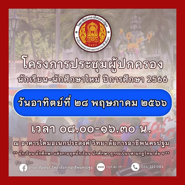 ประกาศวิทยาลัยการอาชีพนครปฐม เรื่อง กำหนดการประชุมผู้ปกครองนักเรียน นักศึกษาใหม่ ปีการศึกษา 2566 รายละเอียดตามเอกสารดังแนบ