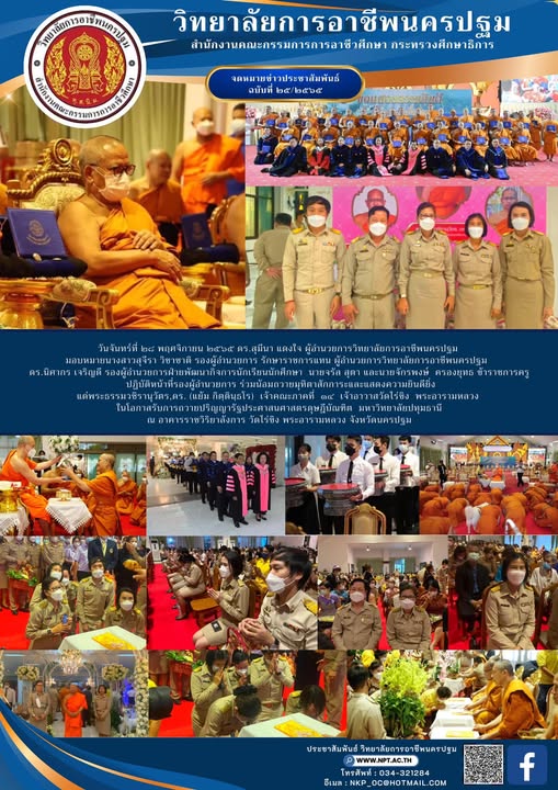 วันจันทร์ที่ ๒๘ พฤศจิกายน ๒๕๖๕ ดร.สุมีนา แดงใจ ผู้อำนวยการวิทยาลัยการอาชีพนครปฐม มอบหมายนางสาวสุจีรา วิชาชาติ รองผู้อำนวยการ รักษาราชการแทน ผู้อำนวยการวิทยาลัยการอาชีพนครปฐม ดร.นิศากร เจริญดี รองผู้อำนวยการฝ่ายพัฒนากิจการนักเรียนนักศึกษา นายจรัล สุตา และนายจักรพงษ์ ครองยุทธ ข้าราชการครู ปฏิบัติหน้าที่รองผู้อำนวยการ ร่วมน้อมถวายมุทิตาสักการะและแสดงความยินดียิ่ง แด่พระธรรมวชิรานุวัตร,ดร. (แย้ม กิตฺตินฺธโร) เจ้าคณะภาคที่ ๑๔ เจ้าอาวาสวัดไร่ขิง พระอารามหลวง ในโอกาสรับการถวายปริญญารัฐประศาสนศาสตรดุษฎีบัณฑิต มหาวิทยาลัยปทุมธานี ณ อาคารราชวิริยาลังการ วัดไร่ขิง พระอารามหลวง จังหวัดนครปฐม