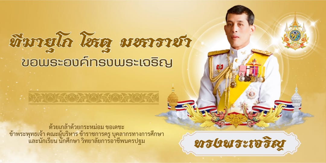 ทีฆายุโก โหตุ มหาราชา ขอพระองค์ทรงพระเจริญ ด้วยเกล้าด้วยกระหม่อม ขอเดชะ ข้าพระพุทธเจ้า คณะผู้บริหาร ข้าราชการครู บุคลากรทางการศึกษาและนักเรียน นักศึกษา วิทยาลัยการอาชีพนครปฐม