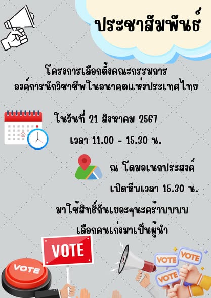 ประชาสัมพันธ์ โครงการเลือกตั้งคณะกรรมการ องค์การนักวิชาชีพในอนาคตแห่งประเทศไทย ในวันที่ 21 สิงหาคม 2567 เวลา 11.00 – 15.30 น. ณ โดมอเนกประสงค์ เปิดหีบเวลา 15.30 น. มาใช้สิทธิ์กันเยอะๆนะคร้าบบบบบ เลือกคนเก่งมาเป็นผู้นำ
