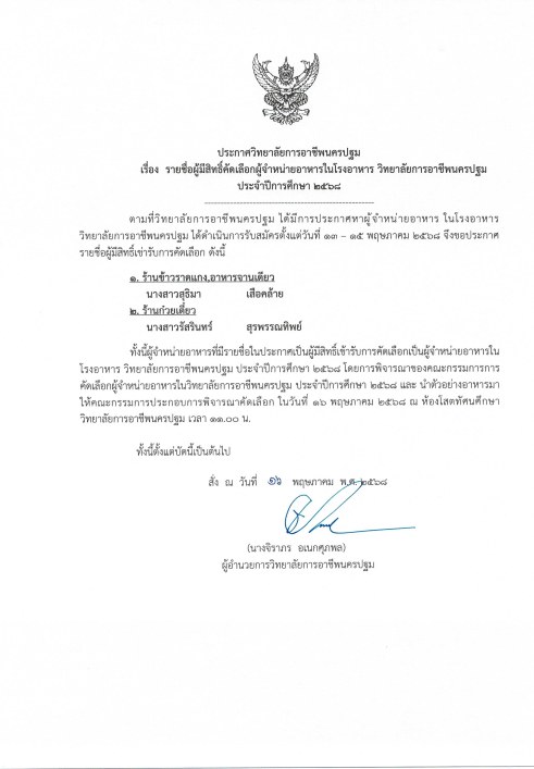 ประกาศวิทยาลัยการอาชีพนครปฐม เรื่อง รายชื่อผู้มีสิทธิ์คัดเลือกผู้จำหน่ายอาหารในโรงอาหาร วิทยาลัยการอาชีพนครปฐม ประจำปีการศึกษา 2568