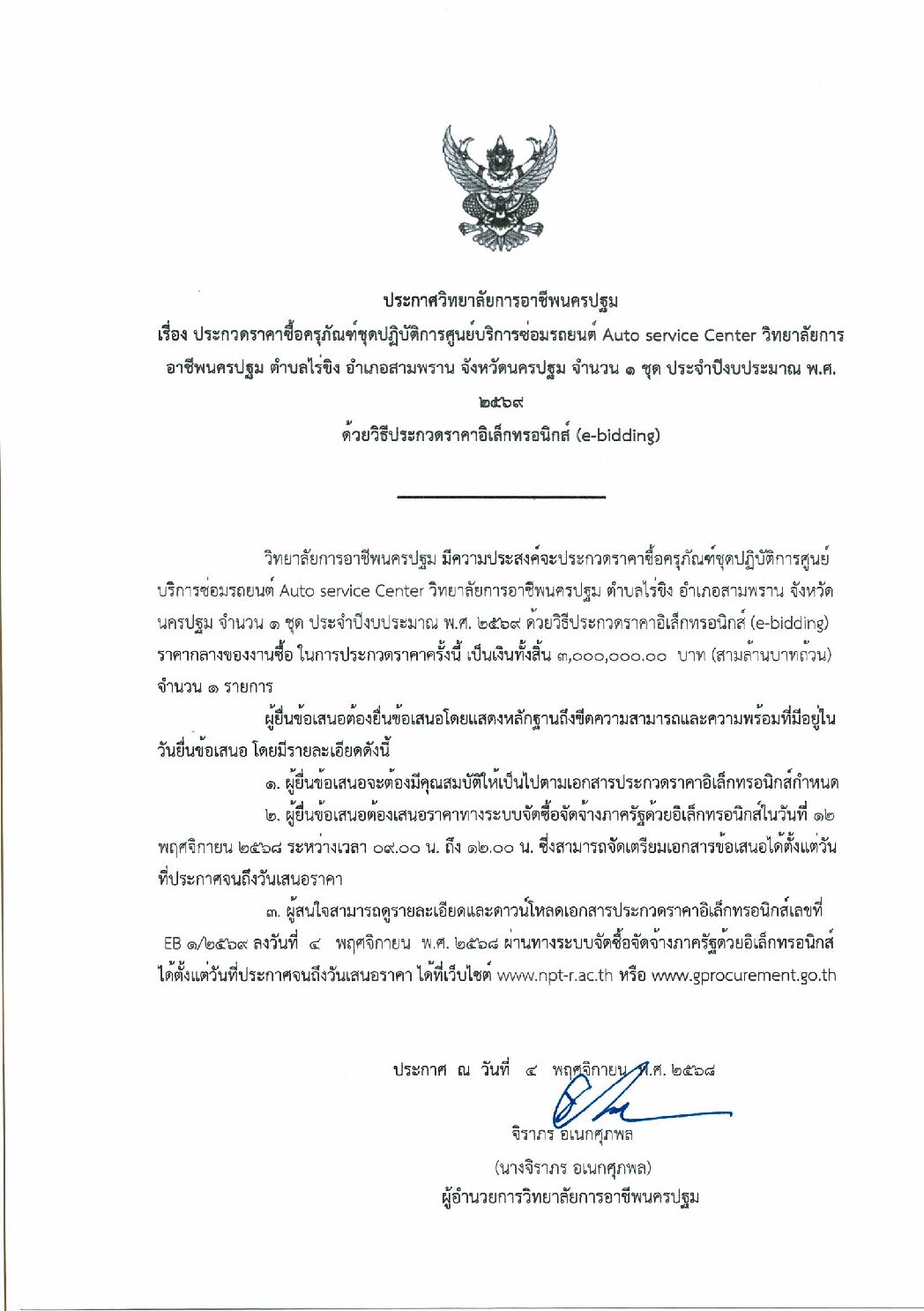 เรื่อง ประกวดราคาซื้อครุภัณฑ์ชุดปฏิบัติการศูนย์บริการซ่อมรถยนต์ Auto service Center วิทยาลัยการ