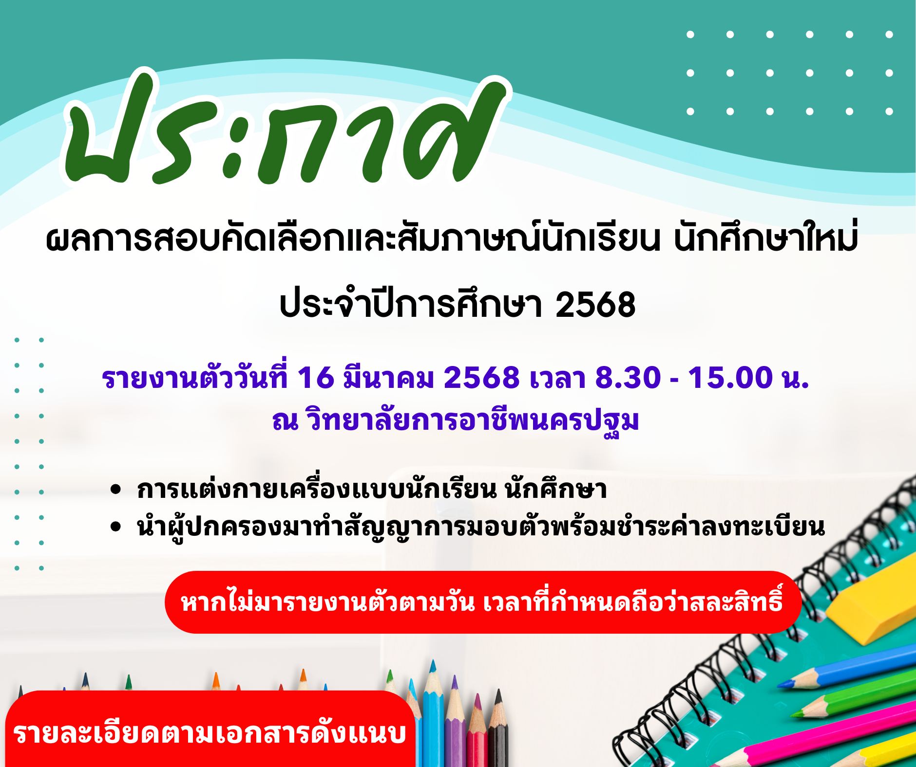 5 มิถุนายน 2568 ประกาศวิทยาลัยการอาชีพนครปฐม เรื่อง ประกาศผลการสอบคัดเลือกเป็นลูกจ้างชั่วคราว ตำแหน่ง ครูพิเศษสอน (แผนกวิชาการตลาด)